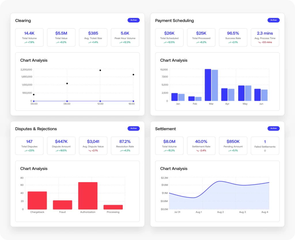 - Clearing – Validate scheme fees, interchange fees, and network adjustments against acquirer records to prevent overbilling and missed charges.