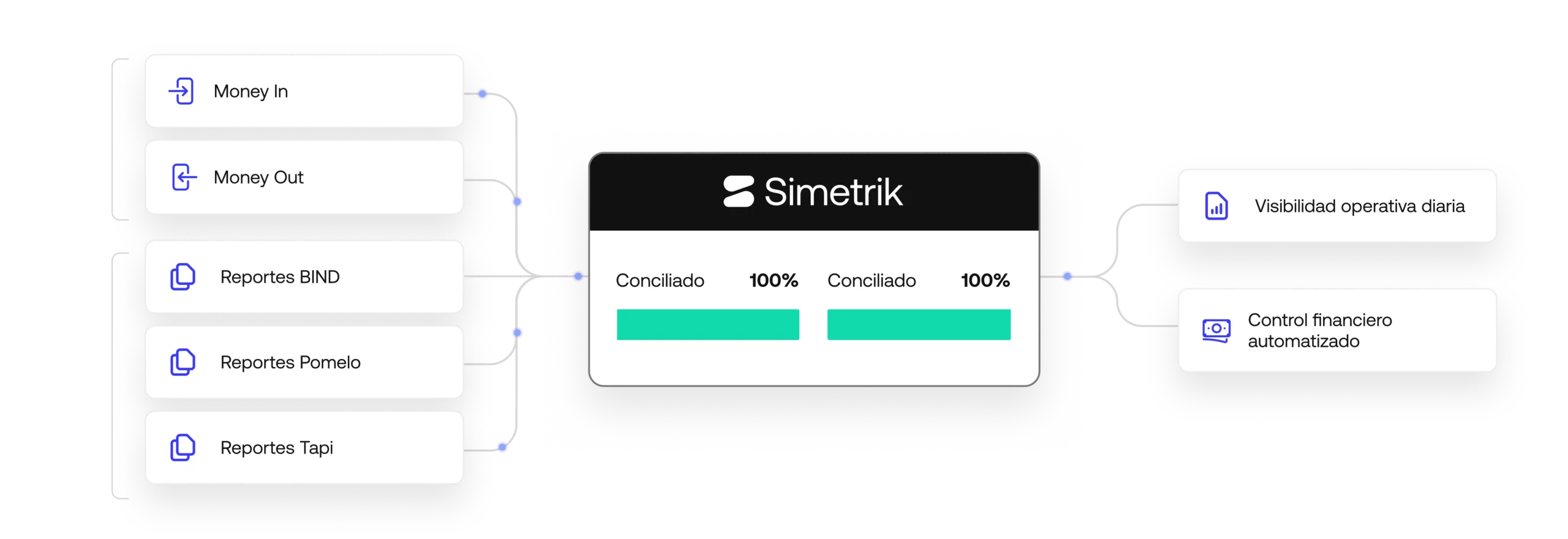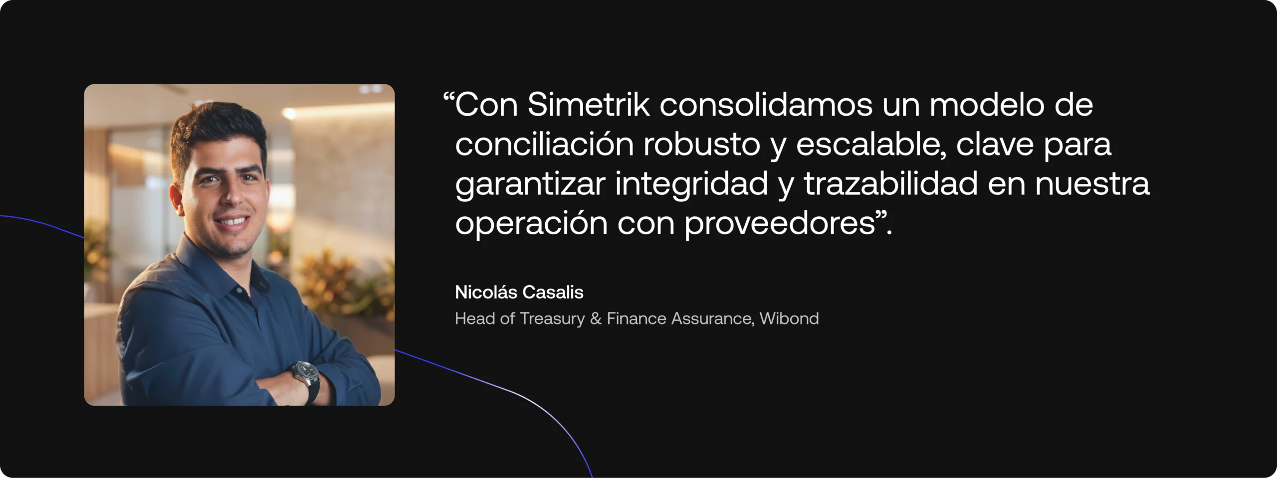 Wibond necesitaba certeza sobre cada transacción que pasaba por su plataforma. Con Simetrik implementó un modelo de conciliación automatizada que cruza su backend contra los reportes de cada provider por identificador único, trazable, escalable y operativo desde el primer día.