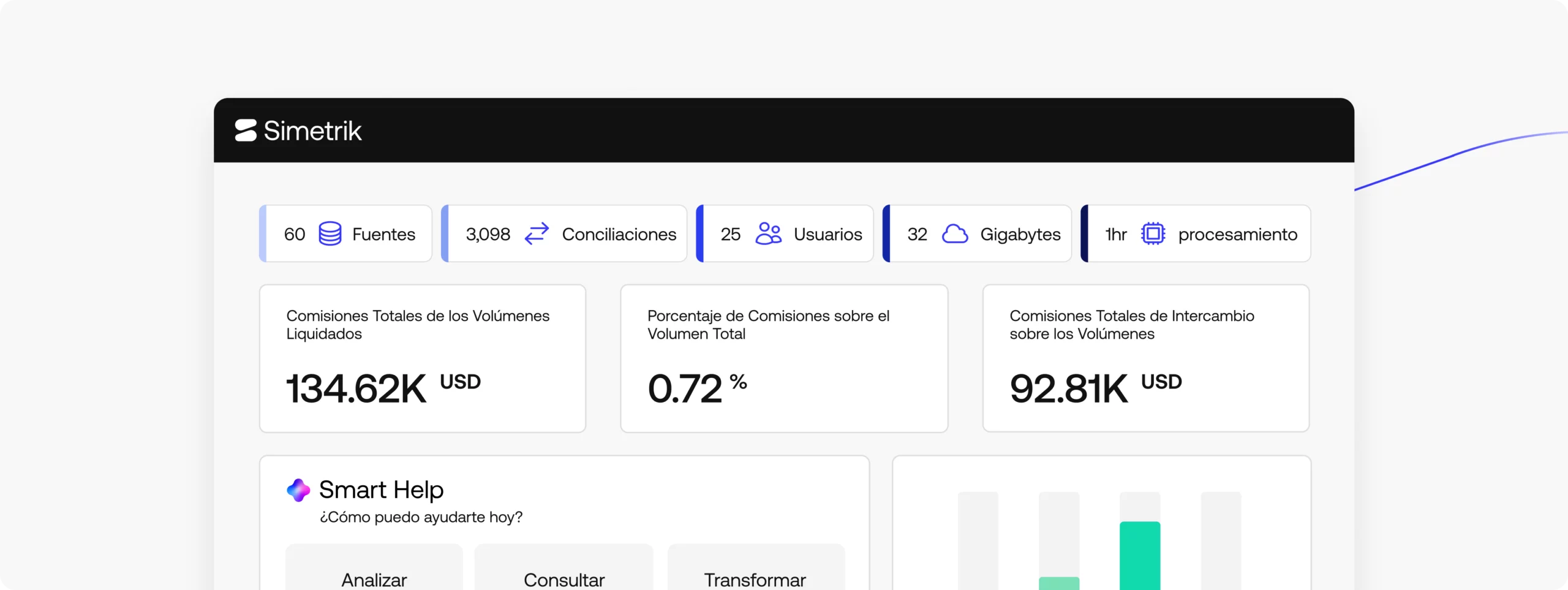 El asistente de configuración de Simetrik conecta tus datos, valida los mapeos y detecta rápidamente las discrepancias.